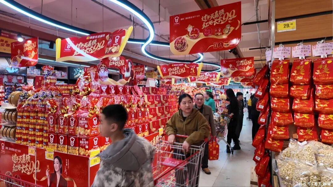 在县城部分商超,年货专区货品充足、陈列整齐。从糖果干货到生鲜礼盒,各类商品供应丰富。市民推着满载的购物车穿梭其间,有序采购。