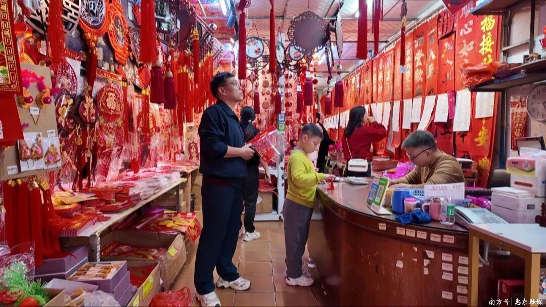 惠东县融媒体中心记者叶琳:“现在我所在的位置是县城街尾井商圈。大家可以看到,我身后街道上车水马龙、人头攒动,沿街商铺都挂满了红灯笼、红对联,门前摆满各式各样的红包与节庆饰品,满眼都是喜庆的中国红。不少家长带着孩子精心挑选,询价、付款的声音此起彼伏,烟火气十足。”